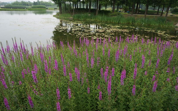 千屈菜又称水枝柳、水柳、对叶莲。属多年生挺水草本植物。株高1米左右,茎四棱形,直立多分枝,叶对生或轮生,披针形。长穗状花序顶生,小花多而密,紫红色,夏秋开花。